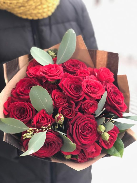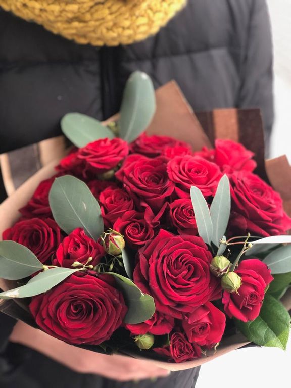 Бордовые одноголовые розы - 9 шт и кустовые розы - 5 шт, эвкалипт