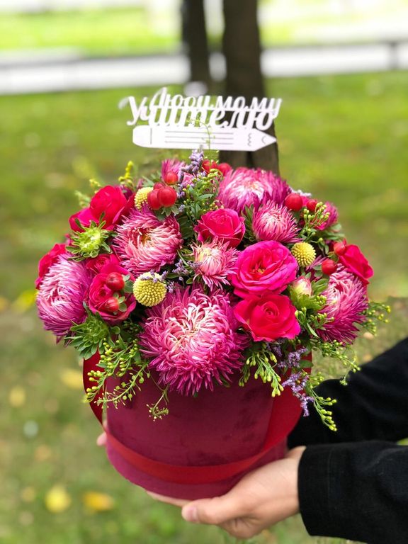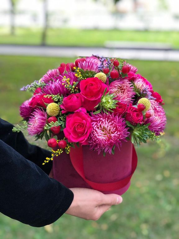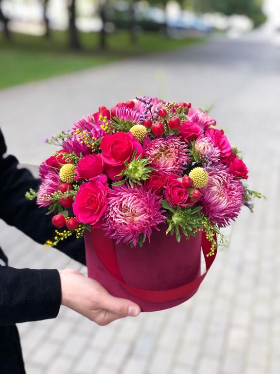 Астры - 9 шт, розы кустовые - 5 шт, краспедия - 6 шт, гиперикум и зелень