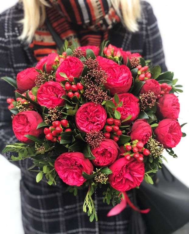Пионовидная роза - 11 шт, гиперикум и зелень