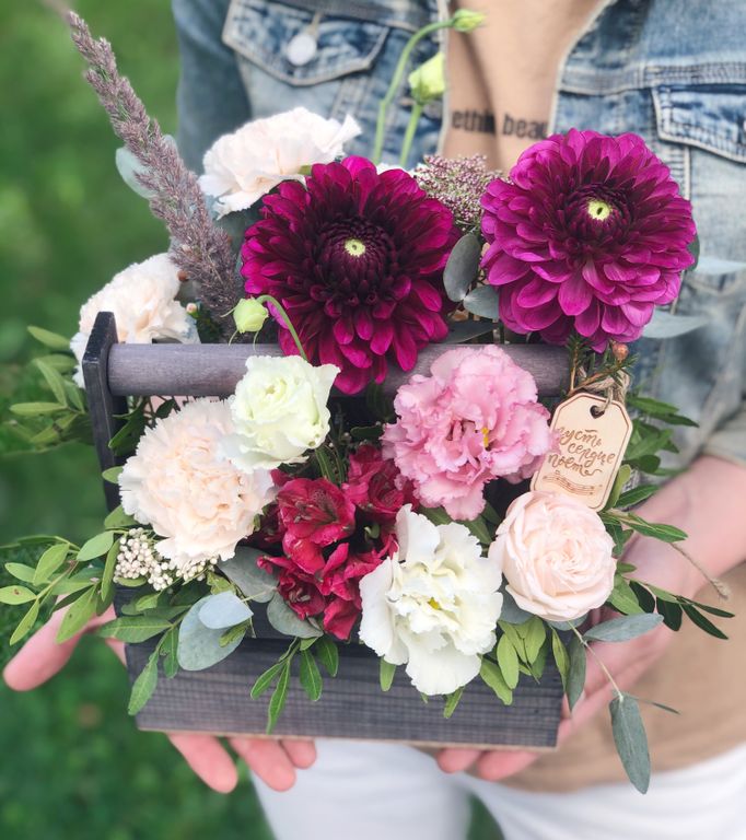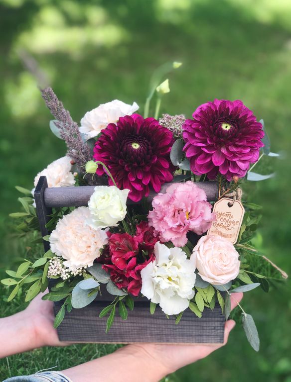 Георгины - 2, диантус - 3, кустовая роза - 1, эустома - 2, альстромерия - 1, эвкалипт и зелень